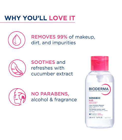 World's first micellar cleansing water invented by Bioderma for sensitive skin - cleanses and eliminates 99 percent of make-up, 98 percent of fine pollution particles and other impurities, consists cucumber extracts for soothing effect, maintains the natural ph. Of the skin, alcohol free.